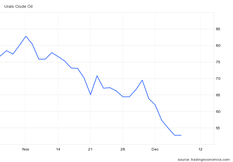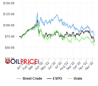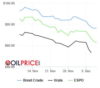 While the price of Russia’s benchmark Urals crude had been declining throughout November, from December 5 onward there is a marked acceleration in the decline, which suggests the cap has indeed had an effect on the price