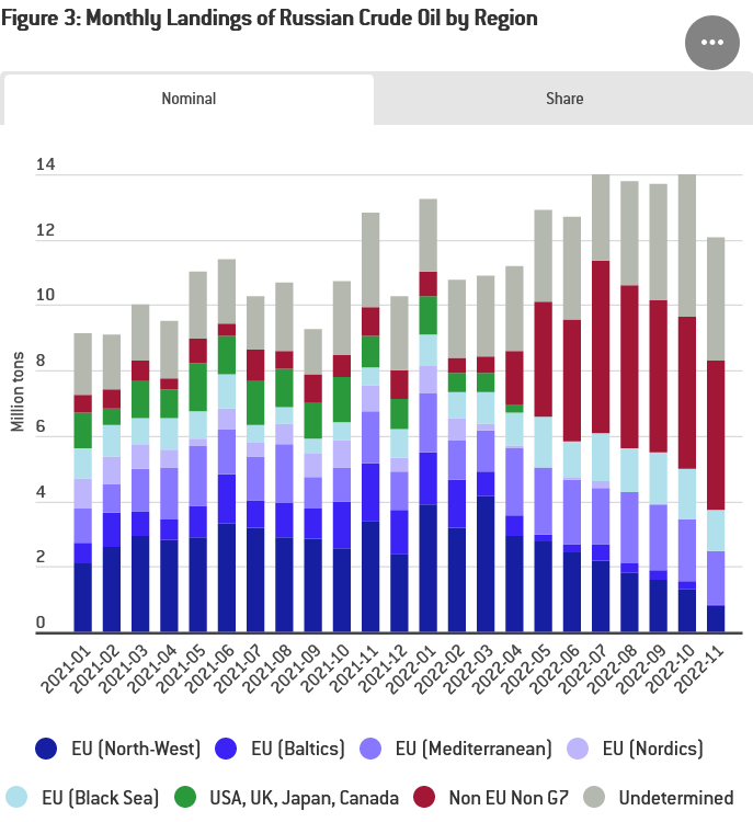 As the volume charts above indicate, this is in part because actual volumes of Russian oil shipped have actually been higher in 2022 than in 2021, with substantial deliveries continuing to be made to the various EU segments, although EU purchases declined right before the imposition of the cap, and, concurrent with the cap, the EU enacted a total embargo on Russian oil purchases by EU member countries.