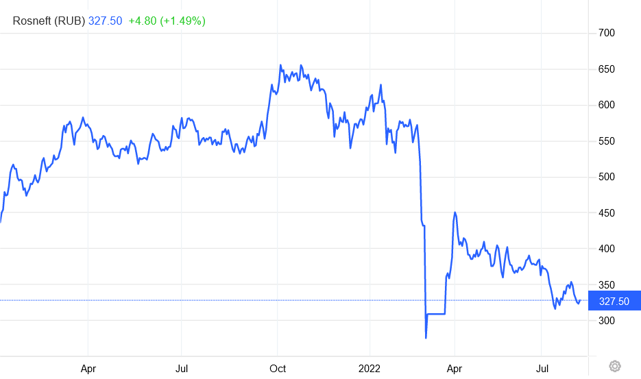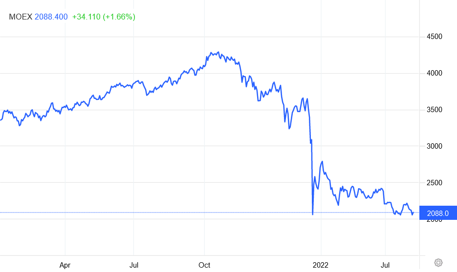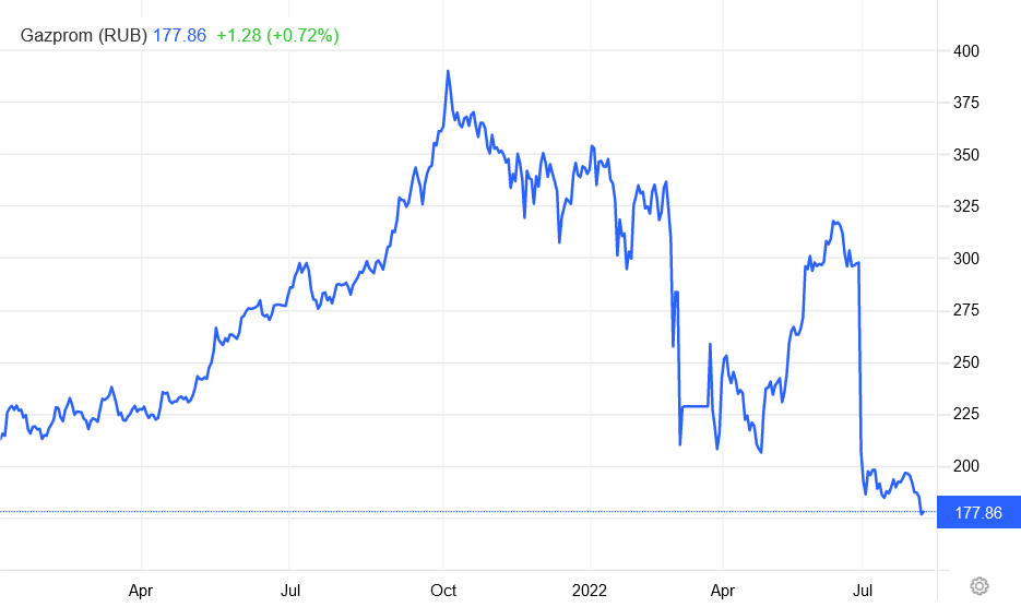 Reflecting the parlous state of the MOEX stocks overall has been Russian natural gas giant Gazprom, who’s stock value plummeted after the Ukraine invasion, broadly recovered, only to plunge again at the end of July—apparently on reports that its natural gas production levels were the lowest since 2008.