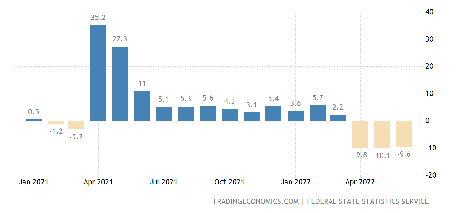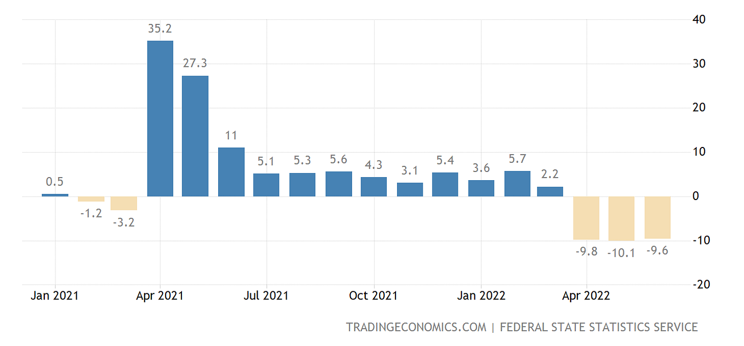 Viewed from a year-on-year perspective, Russia’s retail sales are especially ugly, having been in contraction since April, and in a downward trend overall since April of 2021.