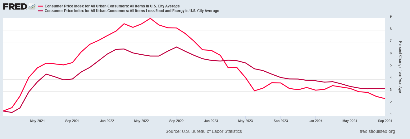 The all items index rose 2.4 percent for the 12 months ending September, the smallest 12-month increase since February 2021. The all items less food and energy index rose 3.3 percent over the last 12 months. The energy index decreased 6.8 percent for the 12 months ending September. The food index increased 2.3 percent over the last year.