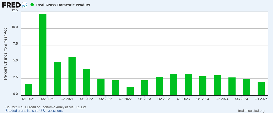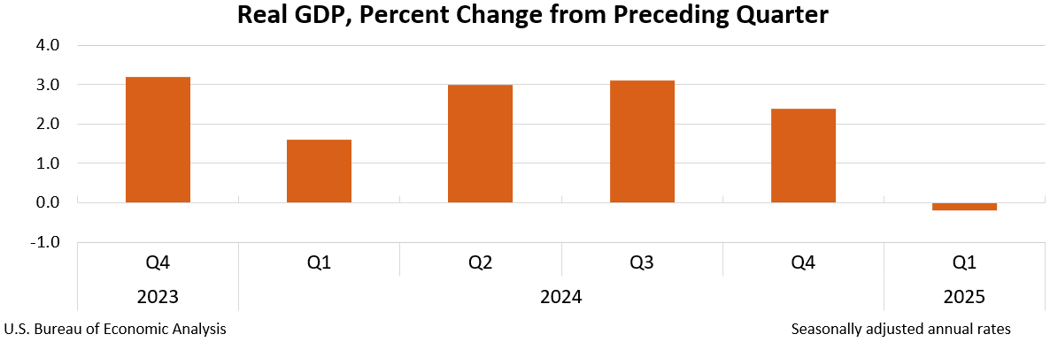 Real gross domestic product (GDP) decreased at an annual rate of 0.2 percent in the first quarter of 2025 (January, February, and March), according to the second estimate released by the U.S. Bureau of Economic Analysis. In the fourth quarter of 2024, real GDP increased 2.4 percent.