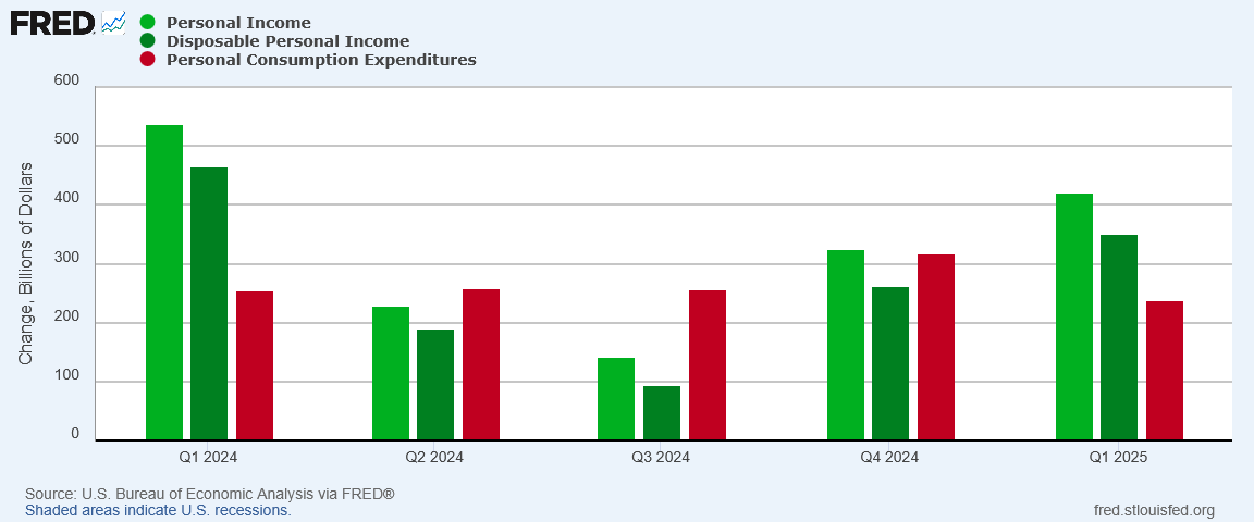 One definite reason to smile: nominal personal income and disposable personal income rose during the first quarter, while nominal personal consumption expenditures fell.