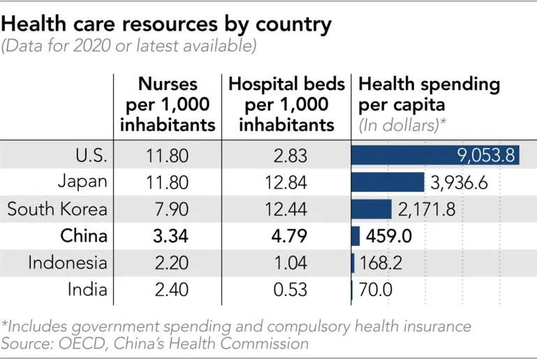 China has sought to reform and build up its health care infrastructure in the past 10 years, but it still faces capacity limitations. The latest available data shows the country had 3.34 registered nurses per 1,000 people, compared to 11.8 in the U.S. China's health spending per capita was $459 in 2018, while U.S. spending came to $9,054 in 2019.