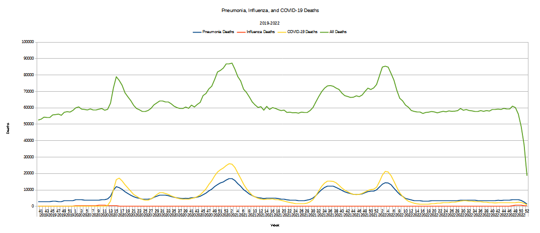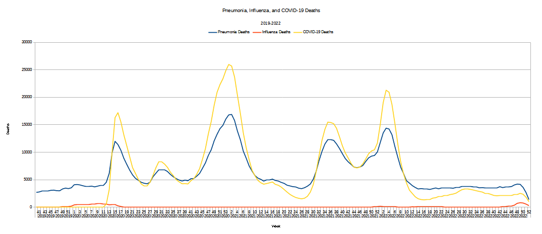 Note that the CDC is engaging in a subtle bit of gaslighting with the red line showing that the percentage of deaths in this country due to Pneumonia, Influenza, and COVID (PIC) is steadily rising. That percentage is rising only because the recent decline in PIC deaths is proportionally smaller than the recent decline in all deaths logged by the CDC.