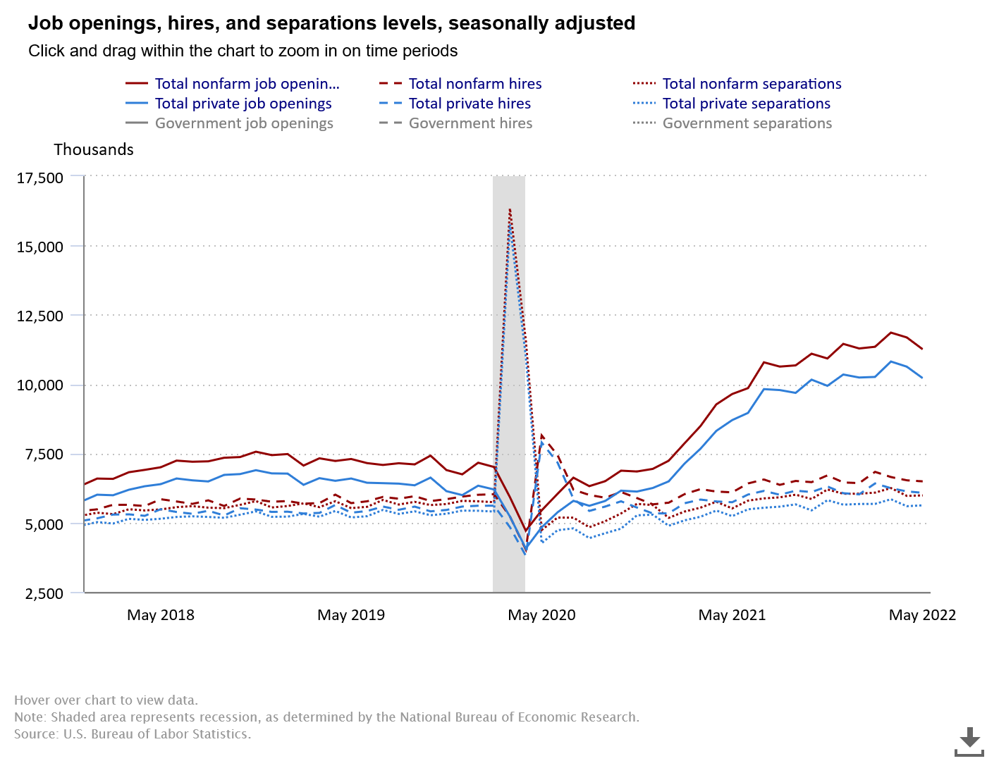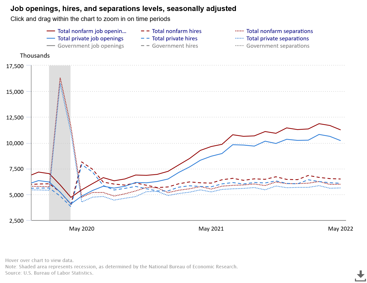 One place where the JOLTS report reconciles to the Employment Situation Report is in the number of unemployed individuals. In May the total number of unemployed individuals was approximately 6 million. With fairly steady trends lines for both hiring and separation, that is not implausible.