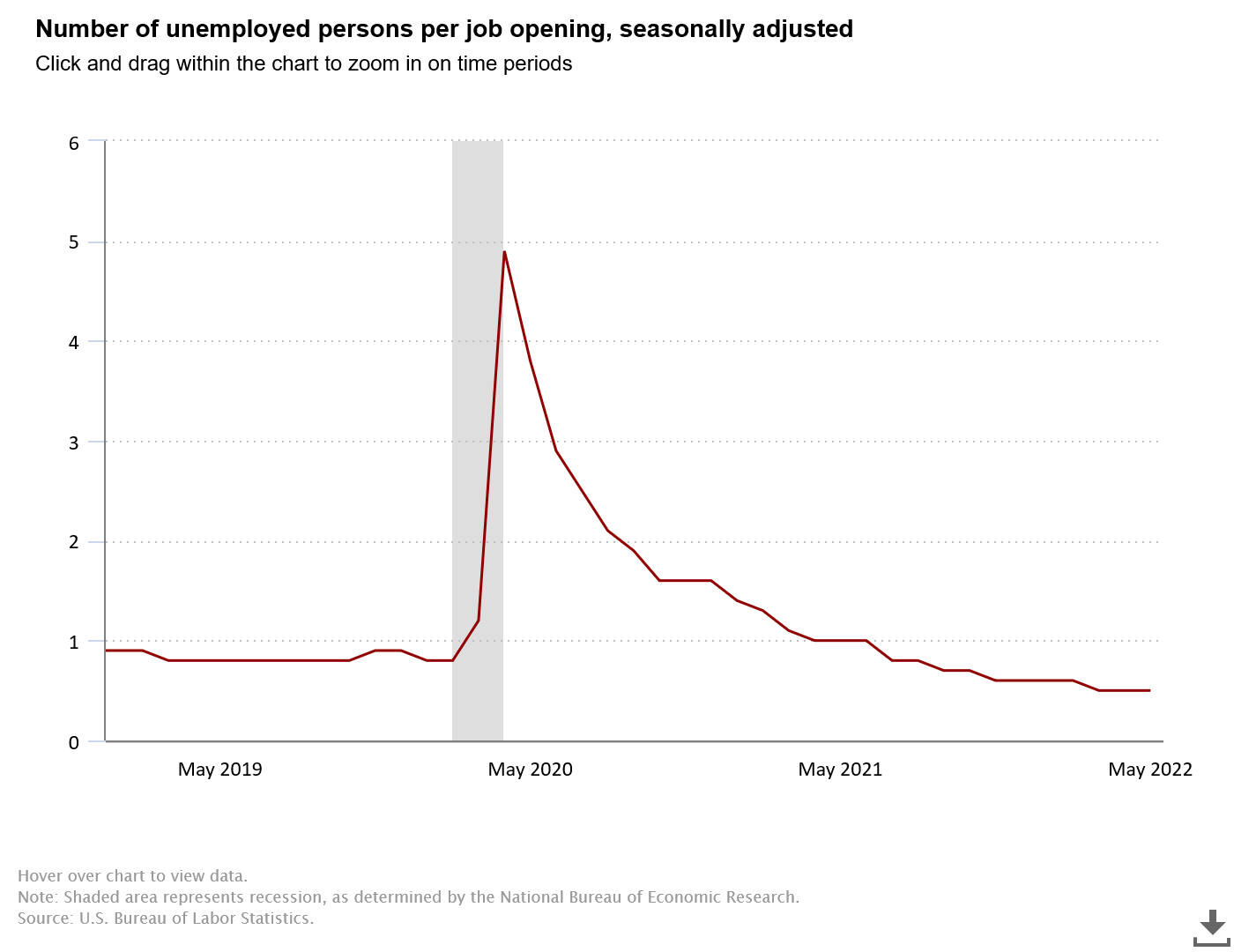According to the JOLTS data, there are only 0.5 unemployed individuals per job opening.