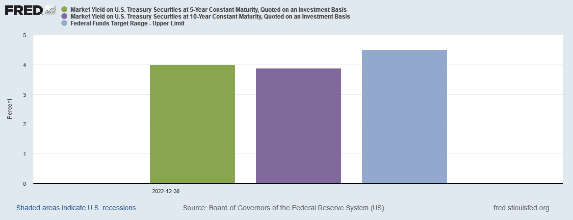 As of the last trading day in 2022, December 30, the 5-Year Treasury had a yield of 3.99%, and the 10-Year Treasury had a yield of 3.88%