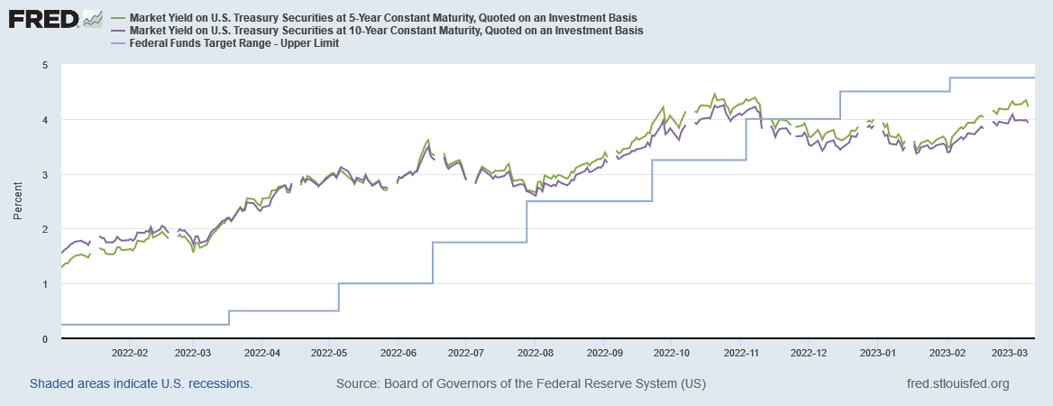 By the time SVB unloaded their interest-bearing portfolio, the yields on both the 5-Year and 10-Year Treasuries had resumed rising, after having plateaued and then declined during the last two months of 2022.