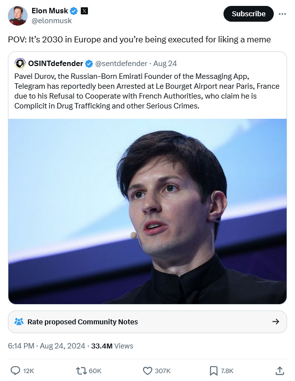 Reaction to Durov’s arrest has been vocal and defiant. Elon Musk—who is embroiled in his own disputes with the European Union regarding free speech on Twitter/X—tweeted shortly after Durov’s arrest hypothesizing people could soon be executed in Europe just for liking a meme.