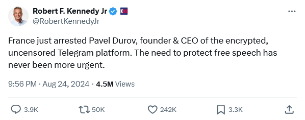"The arrest of Pavel Durov means there is no freedom of speech - it means that freedom of speech in Europe is dead.