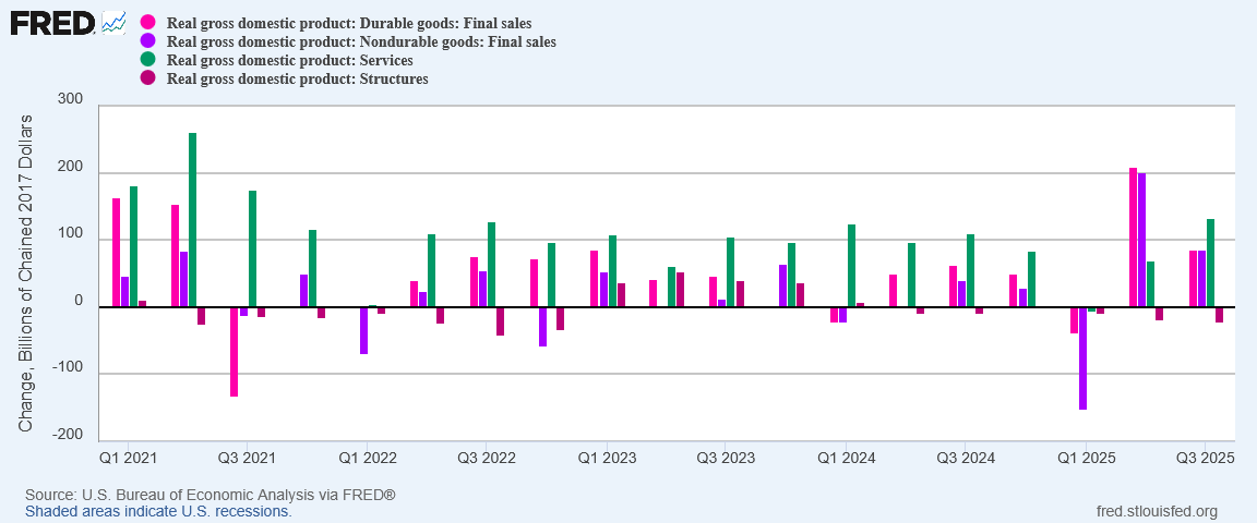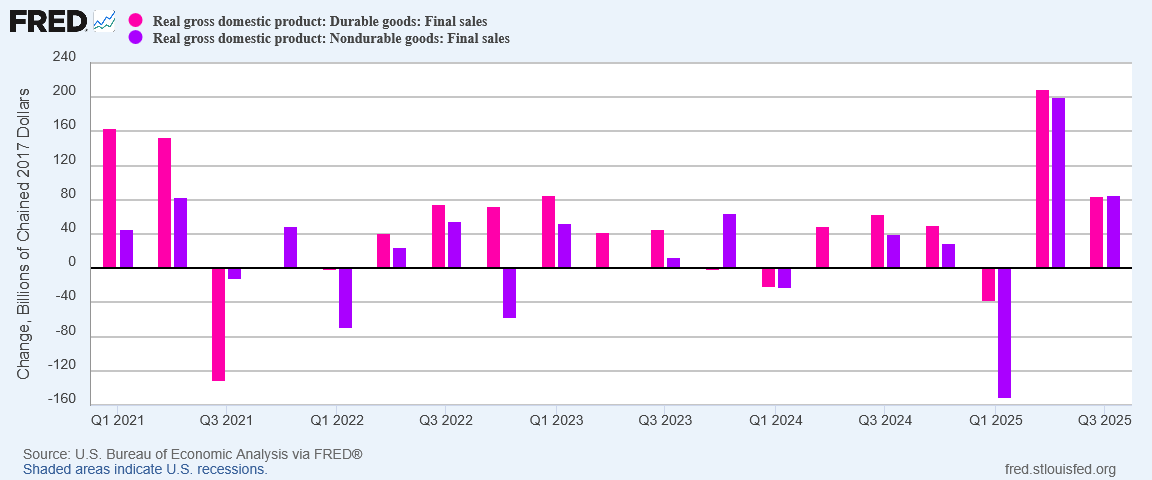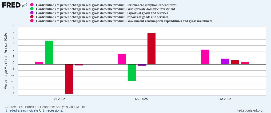 Contrary to the TDS-inflected hand-waving of corporate media regarding the 3rd Quarter GDP Estimate, we do not have great reason to simply disregard the BEA’s estimates. Given that the third quarter ended before the Silly Schumer Shutdown, the likely impact of the shutdown on the third quarter data is likely minimal beyond the publication delay which we have already seen. Whether the Silly Schumer Shutdown will have significant impact on the fourth quarter and 2025 final numbers remains to be seen, although the timing again is likely to have minimal impact—the BEA will have had, by the end of the year, ample time to compensate for data collection disruptions during October.