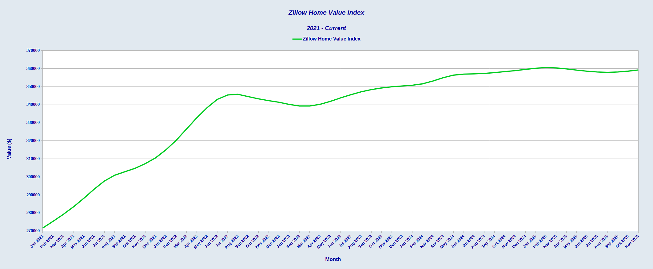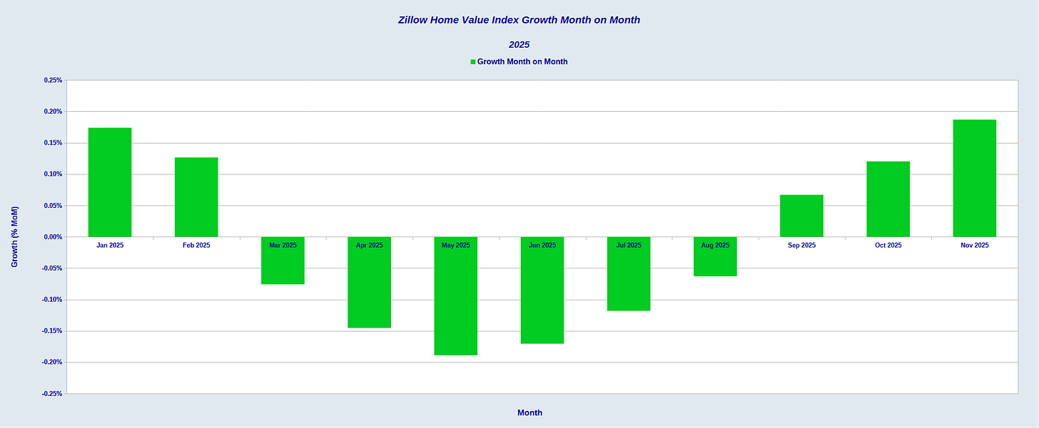 If we zoom in on 2025, we see that, month on month, home valuations declined in the middle of the year, returning to growth only in the last few months.