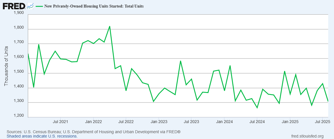 Lack of valuation growth in turn has a negative effect on construction of new housing, as we can see from a steady downward trend in housing starts since 2021.