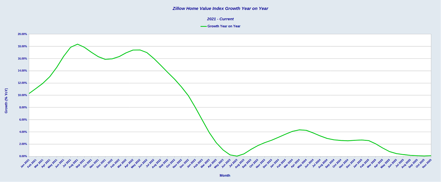 When we look at the private-sector Zillow Home Value Index, we see that home valuations have not risen scarcely at all since the start of the year.