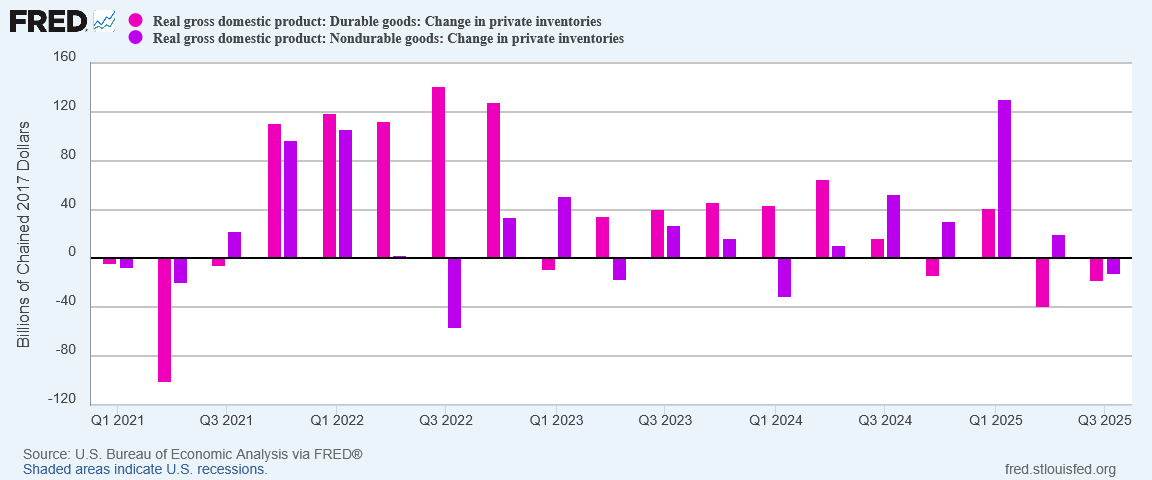 For non-durable goods we can see a clear defensive build during the first quarter—almost certainly in anticipation of tariff-driven inflation effects—but there is no clear defensive inventory build for durable goods. Instead, we see a relatively unremarkable inventory build in the first quarter, with declines in the subsequent quarters despite a surge in durable goods sales in the second quarter.