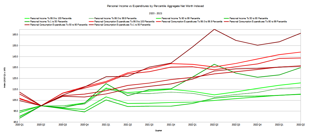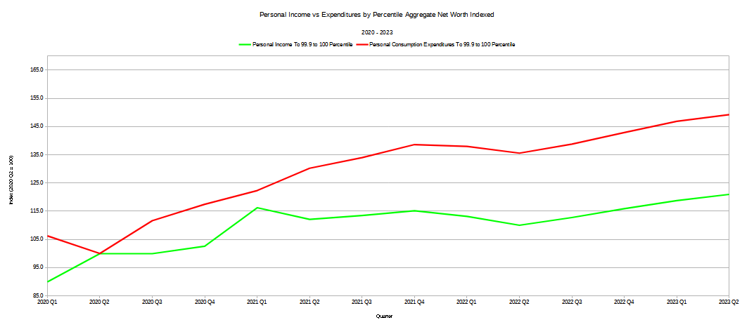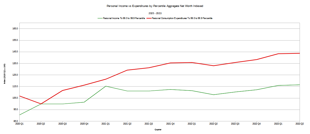 For people in the 99th to 99.9th percentile of aggregate net worth, incomes rose 16.5% while expenditures rose 43.8%.
