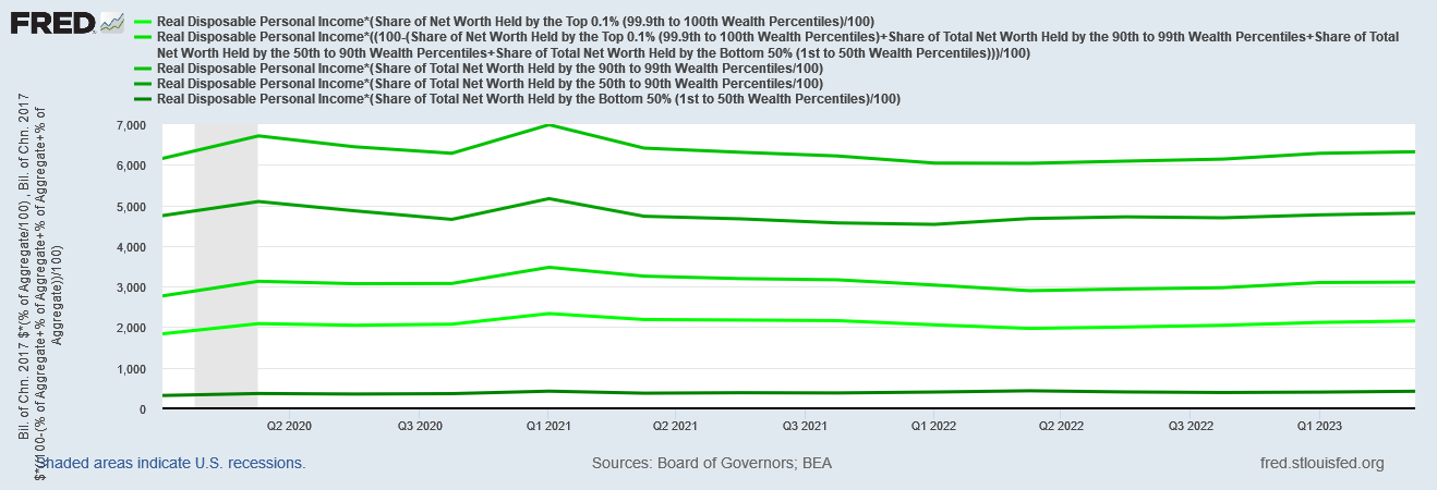 It is important also to realize that for all but the lowest and highest net worth wealth brackets, real disposable personal income has fallen.