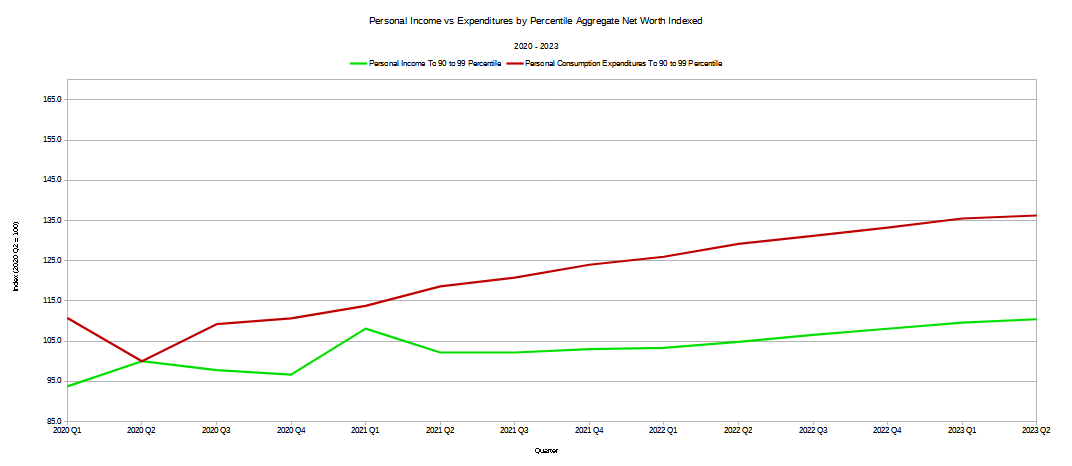 For people in the 90th to 99th percentile of aggregate net worth, incomes rose 10.4% while expenditures rose 36.2%.