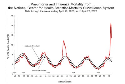 Nationally, using the CDC's FluView tracking data, we can easily quantify the severity of the CCPVirus outbreak. The Pneumonia and Influenza mortality data (which includes all Influenza Like Illnesses including CCPVirus) shows an extreme spike to 14% of cases in mid-April, before dropping down to around 11% as of April 23. P&I mortality above approximately 7% is considered an epidemic level of disease, and in recent weeks the United States has been almost double that.