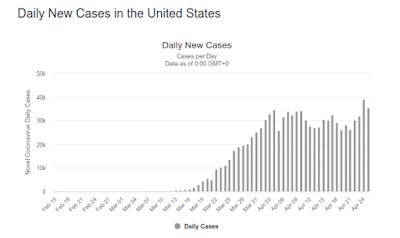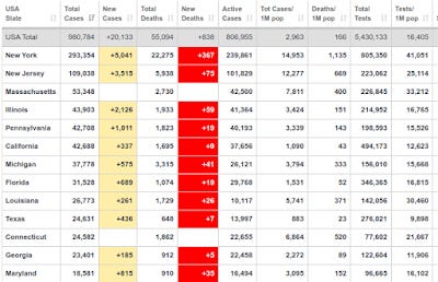 By April 26, the reported number of CCPVirus cases in the United States was 980,784, with 55,094 reported deaths. New York State had 293,354 cases, New Jersey had 109,038 cases, followed by Massachusetts, Illinois, and Pennsylvania in the top five states by case count.