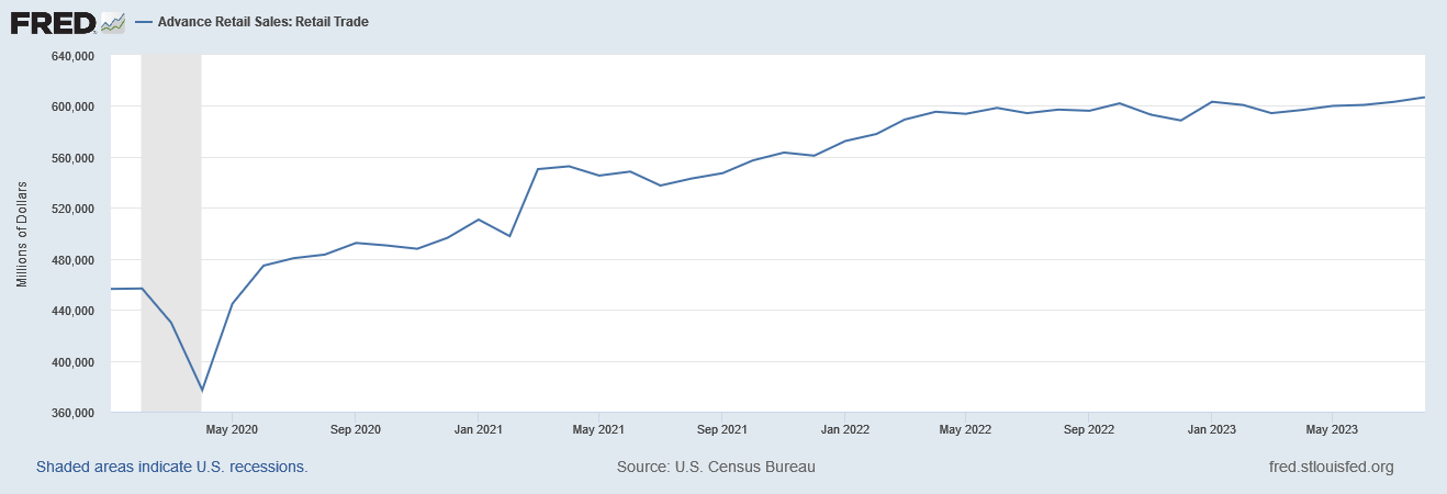 When we look at the Advance Retail Sales data from the U.S. Census Bureau for the past few years, we definitely see significant retail sales growth in the immediate aftermath of the Pandemic Panic Recession.