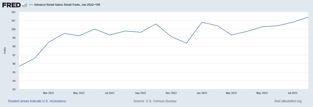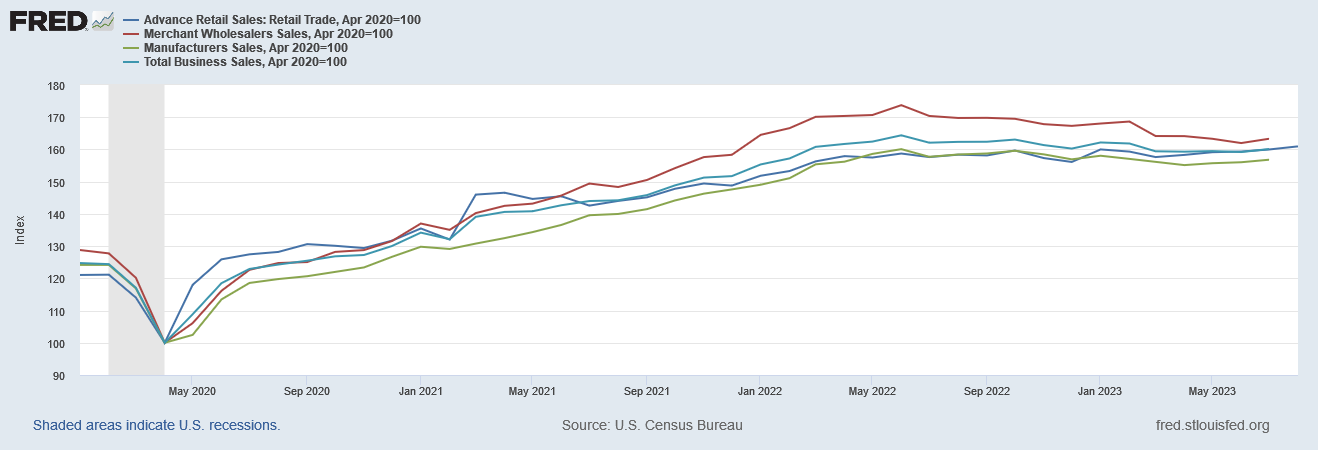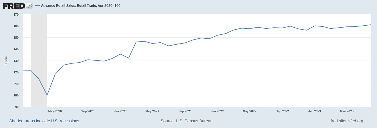In fact, if we index the retail sales data to the end of that recession (~April, 2020), we see that retail sales have grown by more than 60% since then.