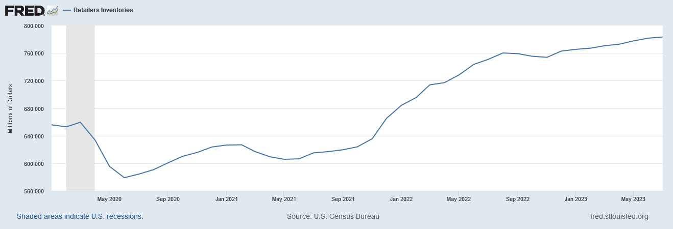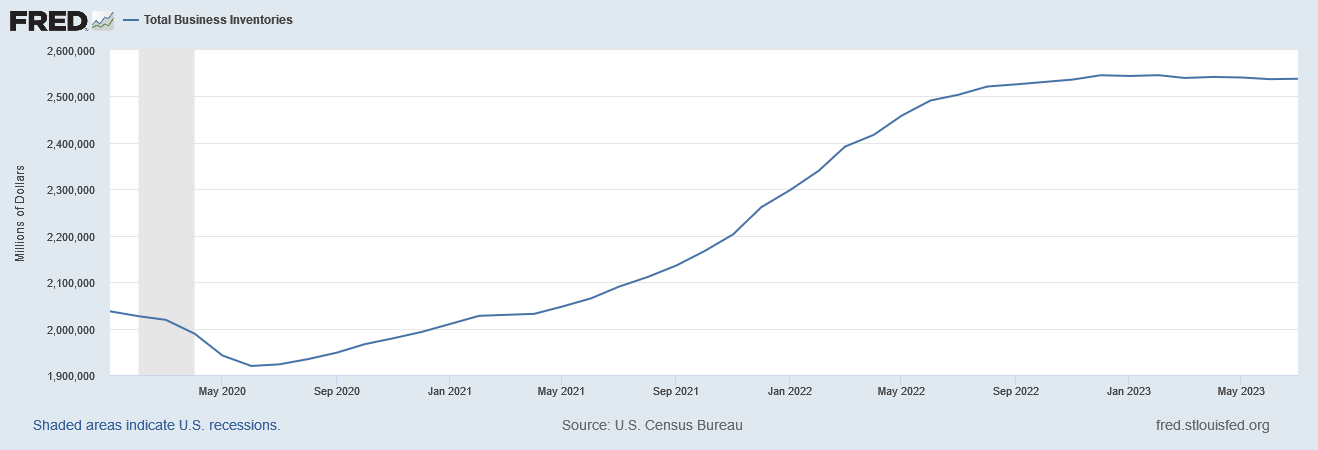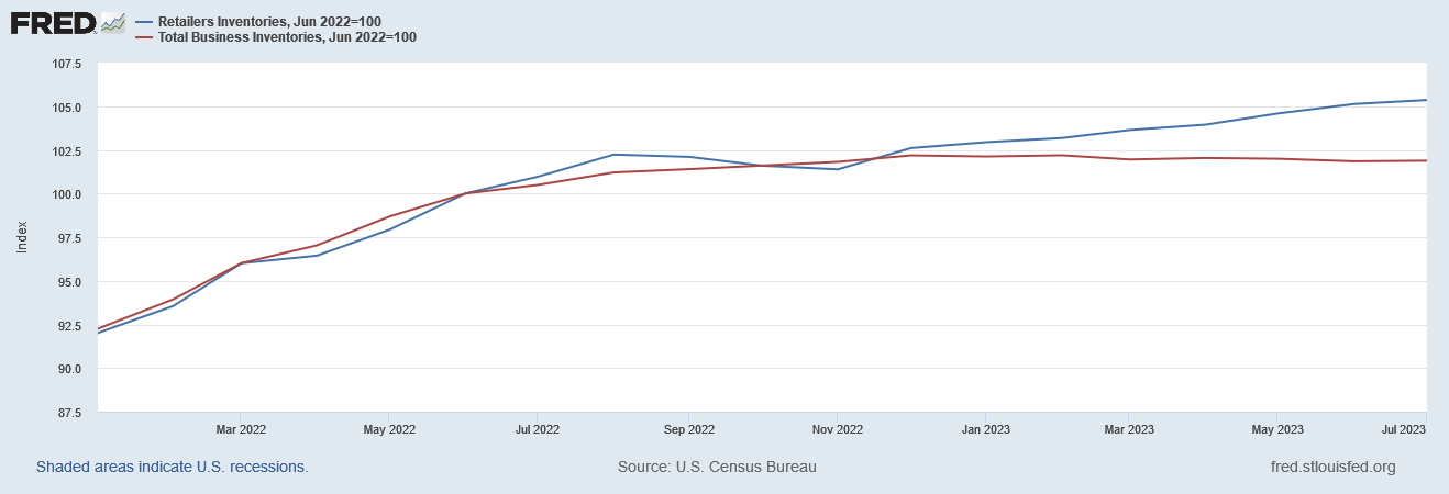 Not only did retail sales stop growing across the board in June of last year, inventories also largely stopped growing as well.