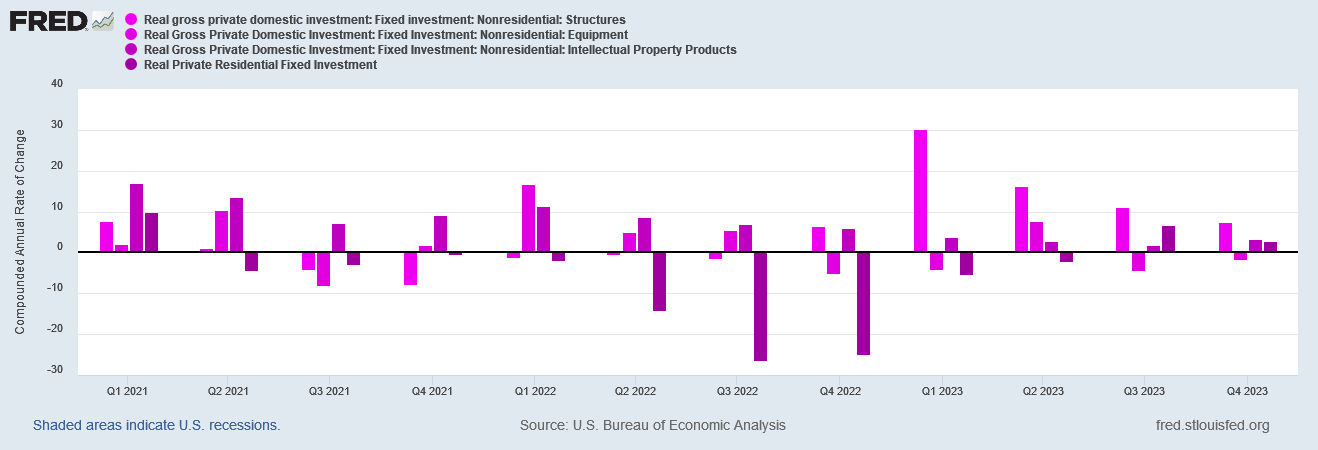 Residential investment growth turned positive in Q3 2023 for the first time since Q1 of 2021. Even that, residential investment growth tapered off significantly between Q3 and Q4 of last year.