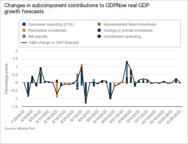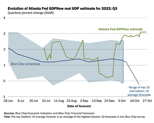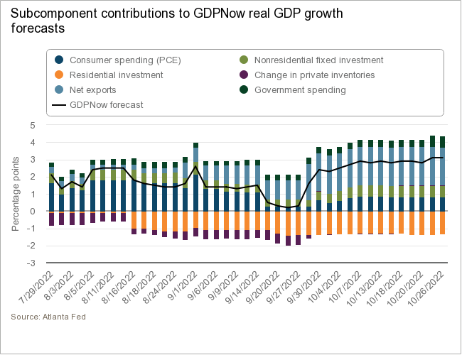 The GDPNow model estimate for real GDP growth (seasonally adjusted annual rate) in the third quarter of 2022 is 3.1 percent on October 26, up from 2.9 percent on October 19. After recent releases from the US Census Bureau, the US Department of the Treasury's Bureau of the Fiscal Service, and the National Association of Realtors, the nowcast of third-quarter real government spending growth increased from 2.4 percent to 3.8 percent, while the nowcast of the contribution of the change in real net exports to third-quarter real GDP growth decreased from 2.23 percentage points to 2.19 percentage points.
