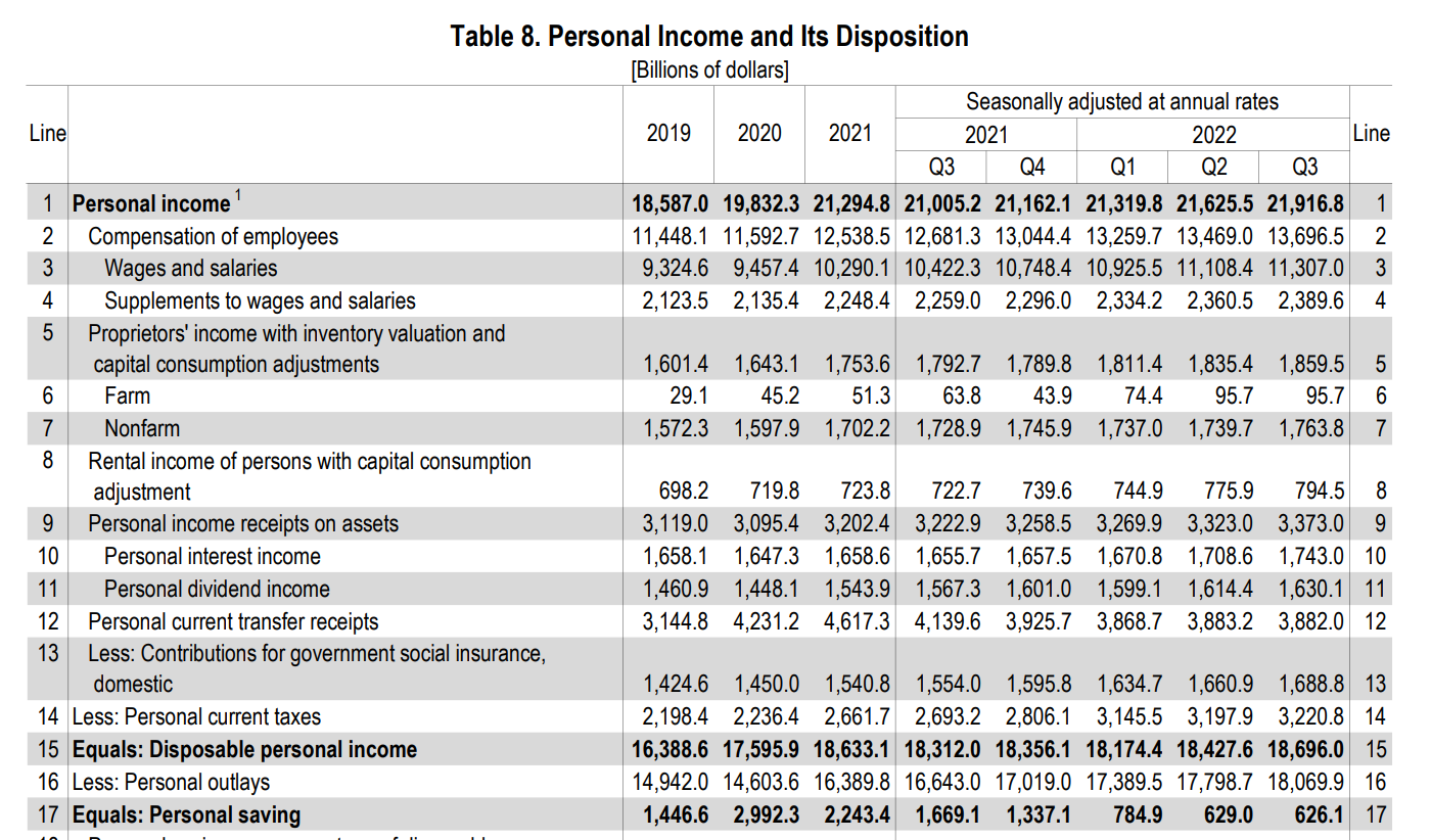 Current-dollar personal income increased $291.2 billion in the third quarter, compared with an increase of $305.7 billion in the second quarter. The increase primarily reflected increases in compensation (led by private wages and salaries) and personal income receipts on assets (table 8).