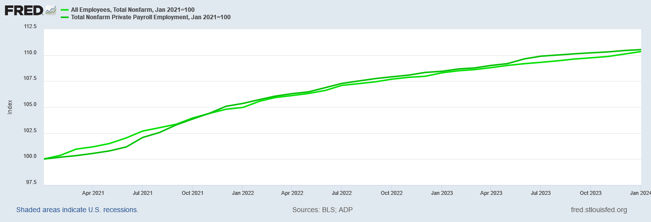 Yet the relative growth trends in government vs private employment are one sided but in the other direction. If we index job growth by sector to January 2023, the largest relative gains come from government employment.