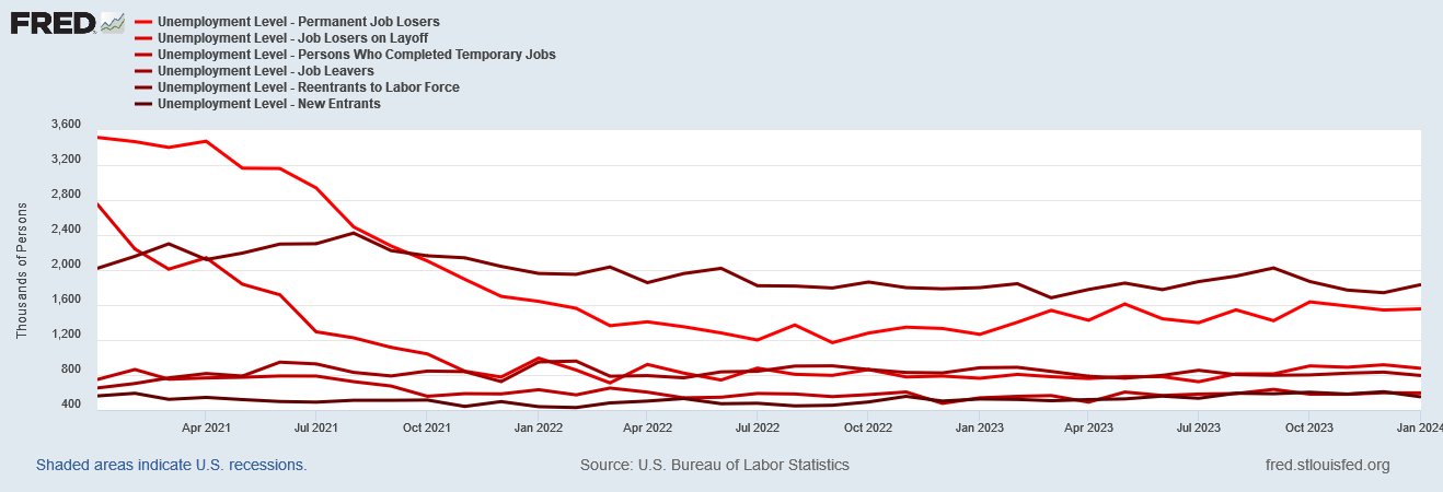 When we look at unemployment levels by reason of unemployment, we find people who have lost their job permanently to be exhibiting the largest relative growth trend over the the past year.