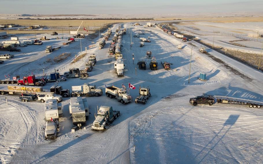 As I noted earlier, support for the Freedom Convoy had already appeared in Alberta, at the US-Canada border crossing near Coutts.