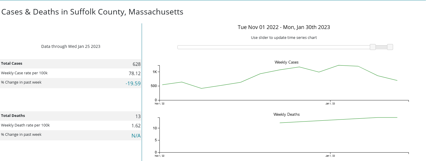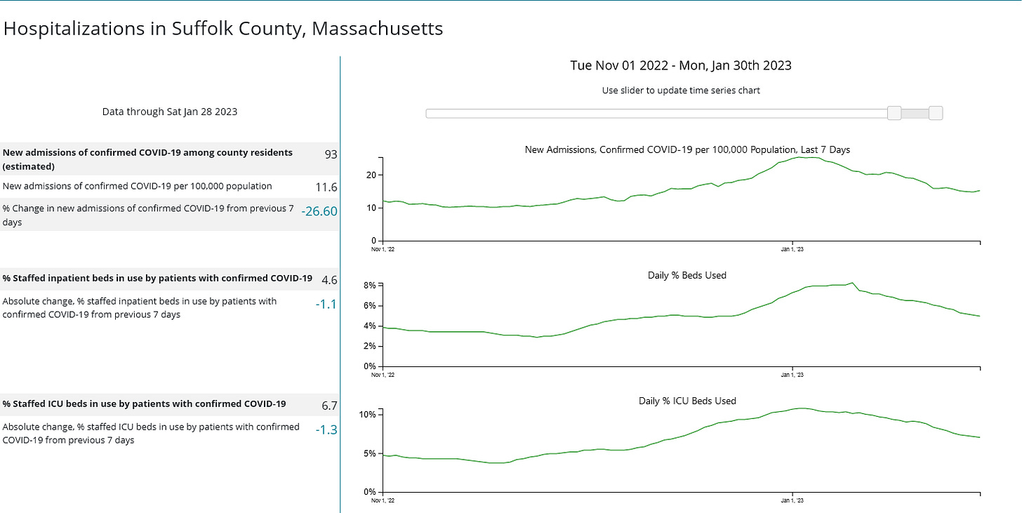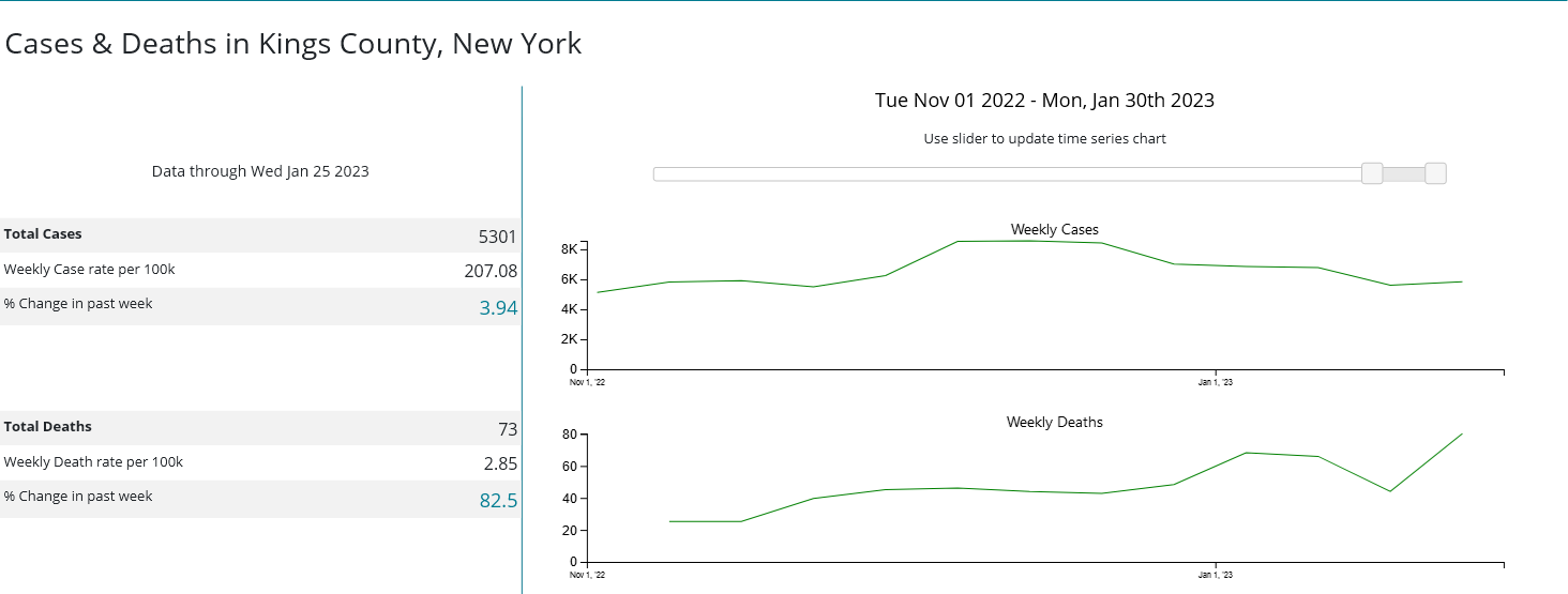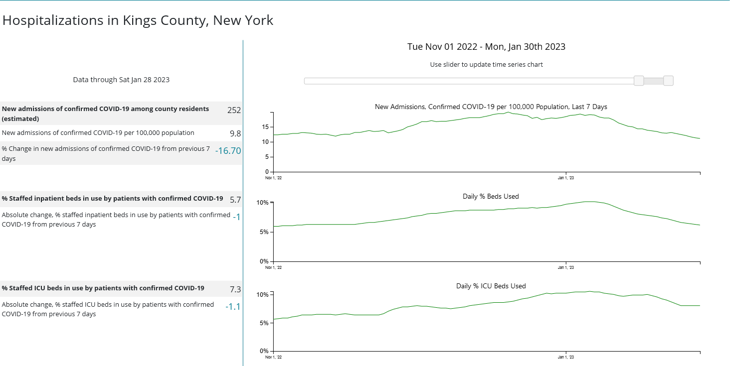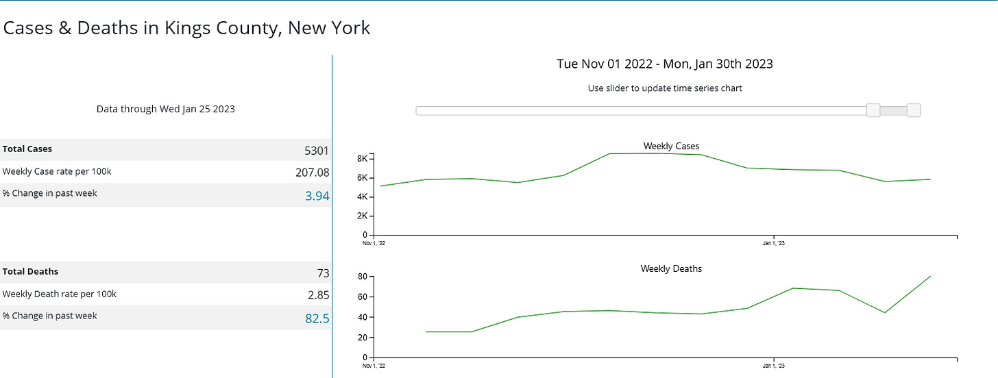 When we look once more at the case counts and hospitalization data from the CDC for Kings County, New York (the most populous county in New York City), we see immediately that cases have been trending down since mid-December, 2022.