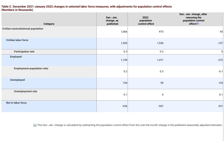 If you're scratching your head trying figure out how those numbers add up, they don't. To get to the top-level numbers in the January report one has to first consult Table C for the “population control effect”.