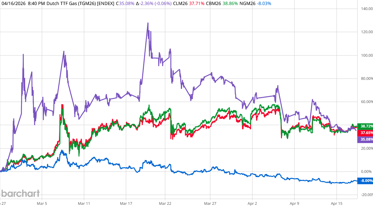 Dutch TTF natural gas is still up nearly 40%, and that’s after talks and rumors of talks have calmed markets down. US natural gas has actually declined in price.