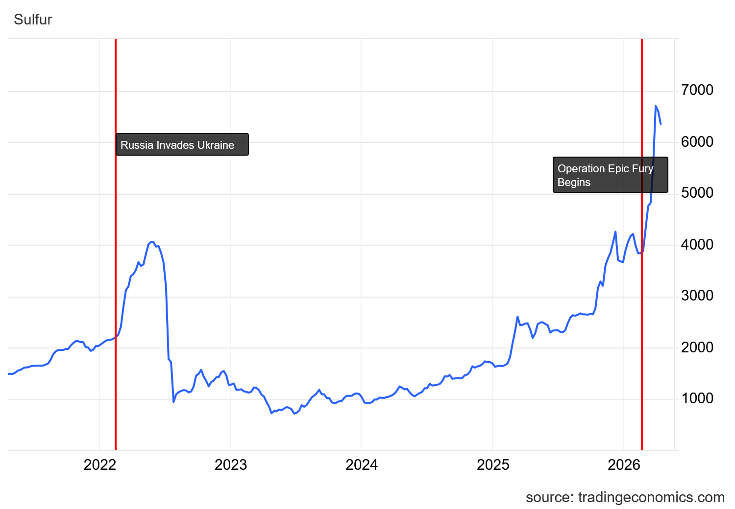 Yet the data shows that China is paying dearly for sulfur right now, as the war with Iran has pushed what China pays for sulfur up more than 65% just since the start of the war.
