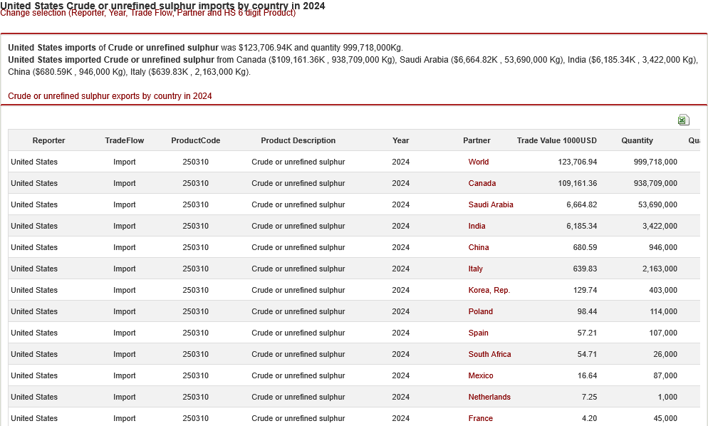 We should also note the quantities of sulfur the US imports: 999,718,000 kilograms is just under 1.1 million tons. The US produces domestically ~8-8.6 million tons of sulfur, which means the US imports between 12% and 13% of its annual sulfur demand.