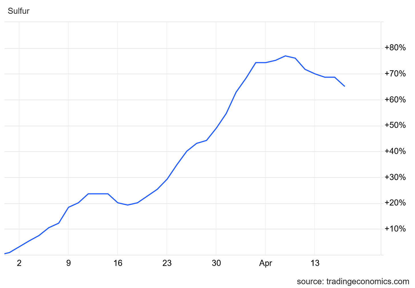 As with all commodities, all markets have some exposure when there is a supply rupture. That is certainly the case with sulfur. Just this month US sulfur prices have surged 34%.