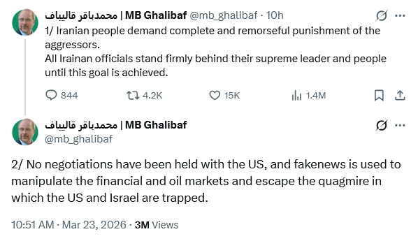 Iranian parliament Speaker Mohammad Bagher Ghalibaf, believed to be the person engaging with US Special Envoy Steve Witkoff, was similarly emphatic: