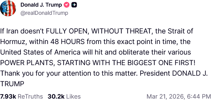 President Trump, faced with Iran continuing to threaten not only oil shipments from the Persian Gulf but oil production itself, responded in typical Trumpian fashion, escalating matters by issuing an ultimatum to Iran, posted via Truth Social: reopen the Strait of Hormuz in 48 hours or the US will begin bombing Iran’s power grid.
