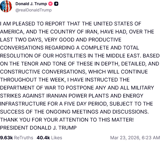 Yesterday morning, President Trump managed to flip the script yet again, posting on Truth Social that he had extended his ultimatum by five days, as a result of “productive” talks with Iran over ending the war.