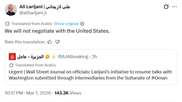 Although the Wall Street Journal published a report yesterday indicating that the Iranian regime wanted to resume negotiations with Donald Trump, late last night Ali Larijani, part of the governing triumvirate running Iran while the clerical Assembly of Experts selects a new Supreme Leader, threw a bucket of cold water on that idea.