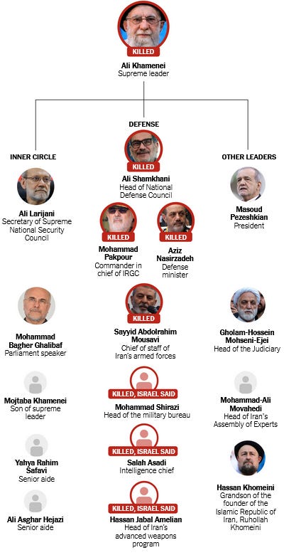 The twin operations are an unqualified success not just because Ayatollah Khamenei was killed. This graphic from the New York Times illustrates how much of Iran’s top leadership has been eliminated.