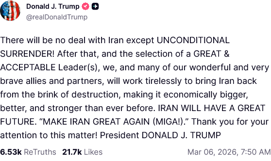 At the same time, on Friday Trump called for “unconditional surrender” by Iran.