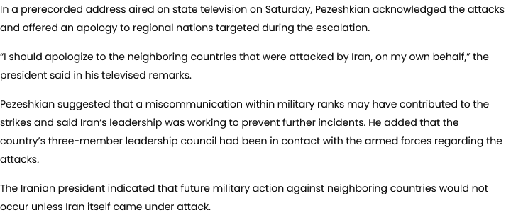 In a bizarre illustration of the “fog of war” at work, Iran’s President Masoud Pezeshkian apologized for the attacks on Iran’s neighbors—even as more attacks ensued.