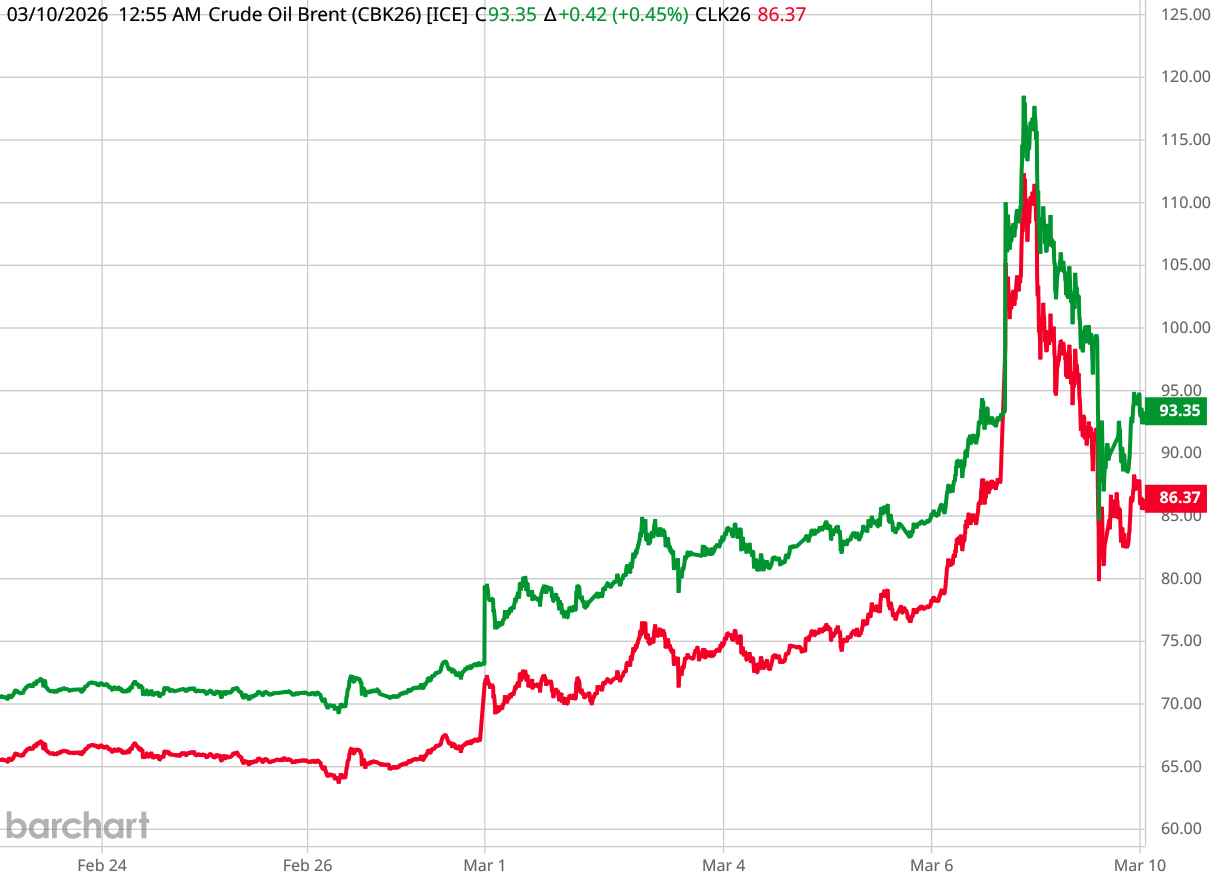Benchmark oil prices have predictably soared as a result of both the real and threatened disruptions to Middle Eastern oil flows, with Brent Crude flirting with $120/bbl over the weekend, while West Texas Intermediate moved past $110/bbl before retreating below $100/bbl by Monday morning.