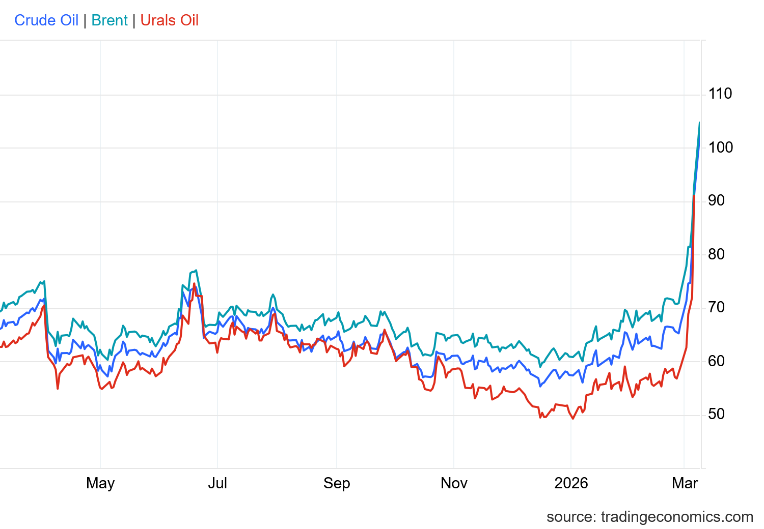 In the short term, one clear beneficiary of the war with Iran is Russia, as its benchmark Urals Crude has moved to its highest prices in five years, reaching $90.97/bbl on Friday, March 6..