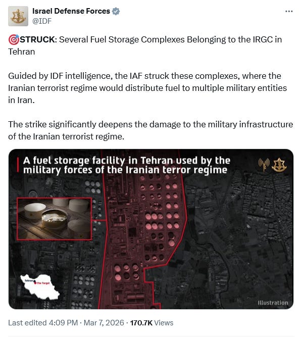 At the same time, it is an open question as to how much “regime” is left for Mojtaba Khamenei to govern. Not only has much of the senior leadership been killed, but Israel and the US are moving on in their strike packages to Iran’s eeconomically and politically vital oil infrastructure, with several oil storage facilities around Tehran being targeted over the weekend.